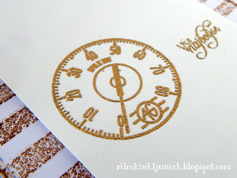 Najprej sem poštempljala ozadje s štampiljko na črte, nato sem izrezala ustrezen kos papirja, na katerega sem odtisnila števec in voščilo ter posula z zlatim reliefnim prahom. Nazadnje sem še konec natrgala ter zlepila skupaj.