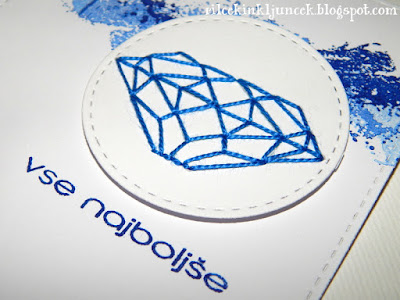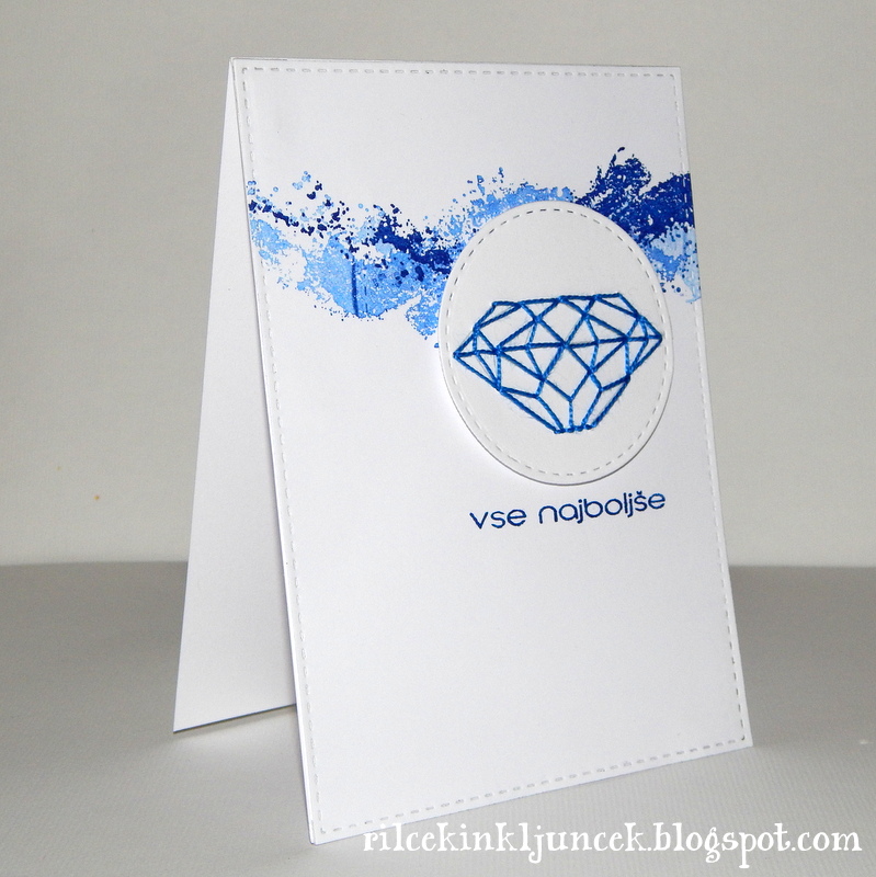 Najprej sem izrezala krog, nato sem še naredila ozadje. Uporabila sem isto štampiljko, le da sem jo obrnila narobe: najprej prvi, nato še drugi odtis brez dodatne barve. Preden sem zalepila krog z diamantom na svoje mesto, sem odtisnila še voščilo.