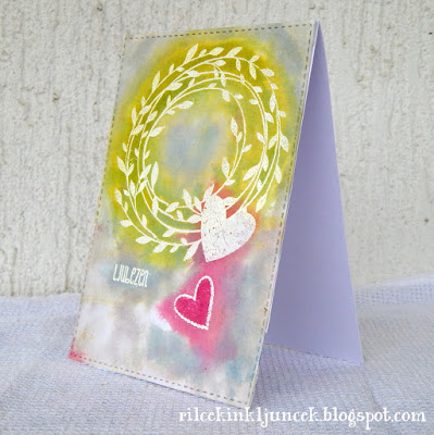 Štampiljko oz. vse štampiljke sem uporabila v negativu. Na akvarelni papir sem naredila odtise z belim reliefnim prahom, nato sem podlago dodobra namočila in premazala z različnimi odtenki Disress Inkov in Izink tušev. Slednji imajo bolj intenzivno pigmentacijo, zato sem uporabila le zelenega za venček in rožnatega za notranjost drugega srca. In tako je nastala enoplastna voščilnica.