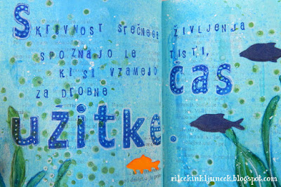 Zelene mehurčke sem naredila s teksturno pasto in šablono, nazadnje sem še dodala ribice, ki sem jih izrezala na mašinco. Ribice sem tudi malo senčila s suhimi akvarelnimi barvicami, ki sem jih potem razmazala z navlaženim čopičem.