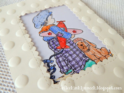 Nameravala sem narediti le preprost bel okvir za osrednji motiv. Za pikčasto ozadje sem se odločila po sili razmer, saj mi je med izrezovanjem ostal odtis s plošče na papirju. To se mi večkrat zgodi. Predvsem nekatere vrste papirja so zelo dovzetne za sprejemanje teh neželenih reliefov. Čeprav zgodnjo ploščo uporabljam le za prekrivanje "sendviča", je na njej vse polno zarez kovinskih šablon, ki se včasih prenesejo na papir - predvsem na večje površine in na določene vrste papirja. Se to dogaja tudi vam?