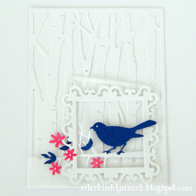 Za izhodišče sem vzela voščilnico Michelle Last. Na belo podlago sem prilepila drevje, ki sem ga izrezala s šablono, nato sem izrezala ostale dele. Najprej sem na osnovo z drevesi zalepila trak iz pergamenta nato vse ostale elemente.