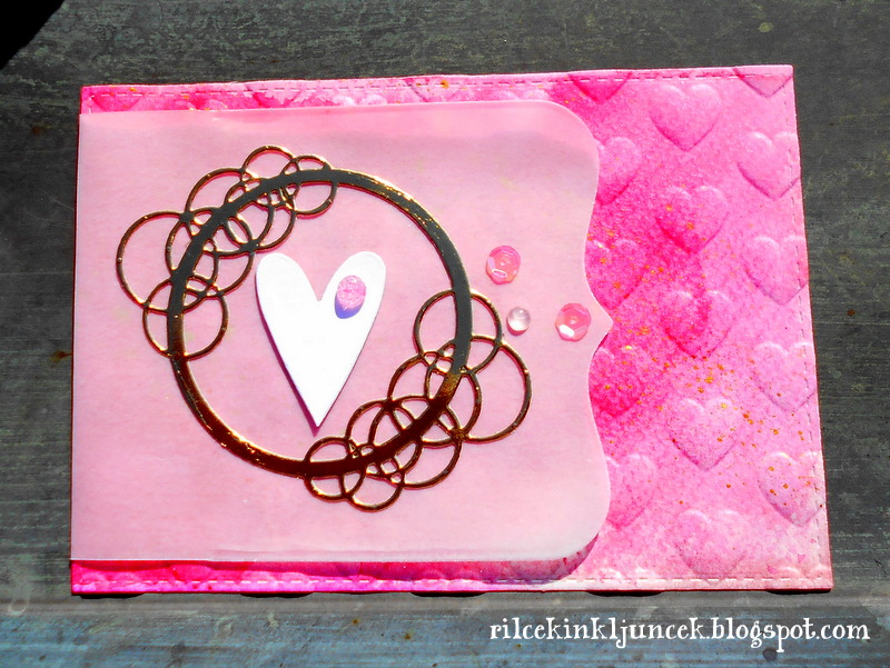 Tokrat sem res počakala, da se je osnova dobro posušila, saj je sledilo embosiranje. Uporabila sem eno izmed prvih štampiljk, ki sem jih kupila, ko sem začela izdelovati voščilnice, to je Hero Artsova štampiljka, La lettre. Čez pisavo sem posula bakren reliefni prah. S prahom sem zaključila tudi robove. Podobno sem postopek ponovila na koščku valovite lepenke. tudi ta je ostanek predhodnega ustvarjanja, le da sem osnovo ohranila bolj belo, da izstopa od podlage. Na koncu sem s pomočjo pahljačastega čopiča površino poškropila z oranžnim Izink tušem, nato še z belim. Med sušenjem sem izrezala srce - pred leti sem kupovala šampon v kovinskih tubah (žal ga nimajo več) in te tube sem reciklirala, imam še kar nekaj kovinskih lističev. Besedo sreča sem izrezala iz recikliranega črnega kartona ter jo malomarno premazala z zlatim Izink tušem. Nazadnje, ko je bilo že vse zlepljeno skupaj, sem notranje srce še napolnila z belim Enamel Dots.