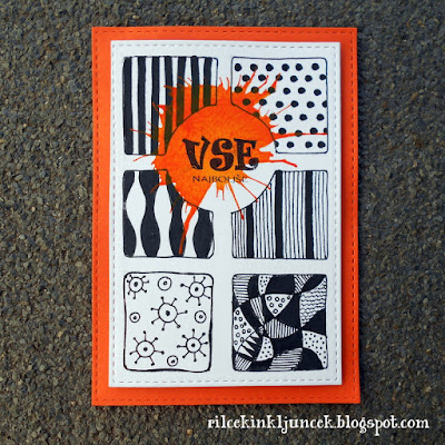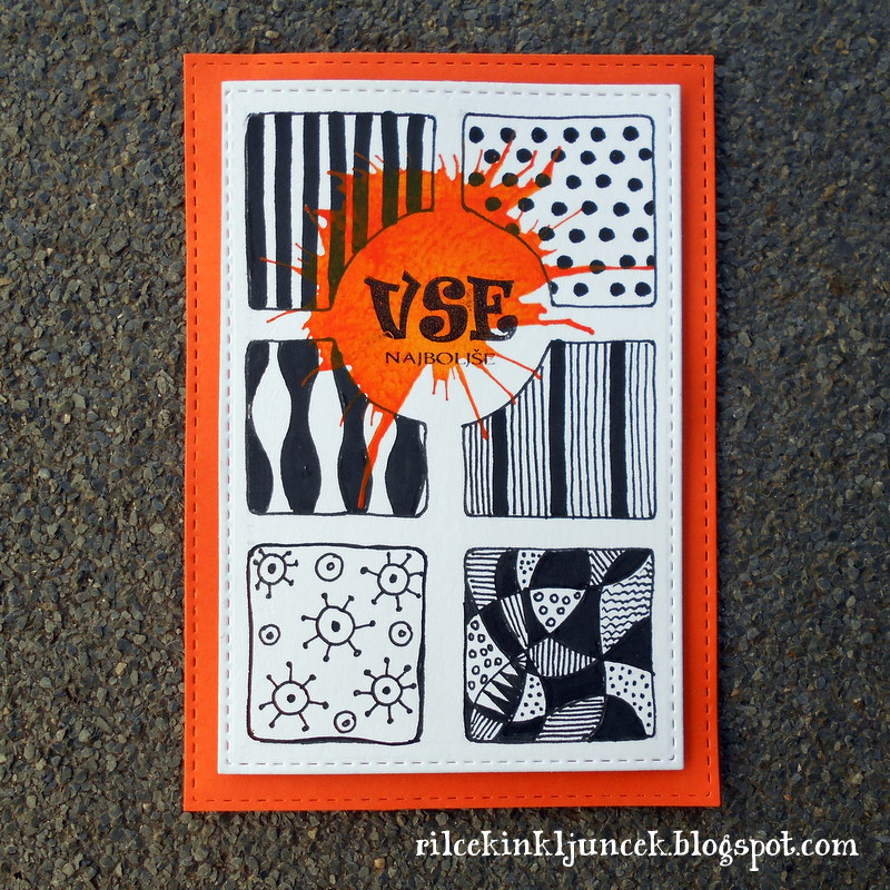 Najprej sem s svinčnikom začrtala robove šestih polj, nato pa sem začela risati direktno na papir s tanjšim in debelejšim črnim flomastrom. Nazadnje sem še na sredino kapnila kapljico oranžnega Izink tuša ter jo razpihala s slamico. Očitno nisem bila dovolj pozorna pri držanju slamice, saj mi je večino barve potisnilo navzgor. Je pa zato navzdol in desno lepši vzorec. Čisto na koncu sem odtisnila še voščilo ter vse skupaj pritrdila na oranžno osnovo za voščilnice.