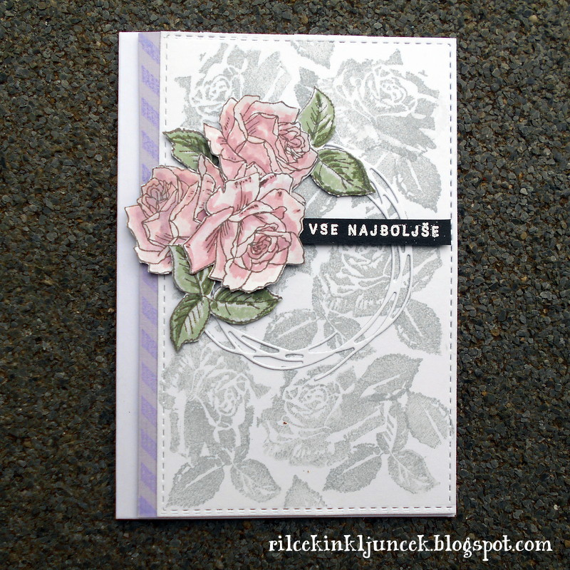 Tokrat sem uporabila večslojno štampiljko, čeprav sem na koncu vrtnice pobarvala z Distress Inki. Kombinacija barvnih blazinic ni prinesla želenega rezultata. Najprej sem pripravila kartonček za ozadje, ki sem ga malo zožala, da sem dobila tanek rob na levi strani. Ta kartonček sem prekrila z vrtnicami v sivi barvi. Uporabila sem drugo štampiljko (od štirih plasti) tako za cvet kot za listje. Pri tem sem ustvarila masko, da sem zaščitila cvetove ob tiskanju listja.