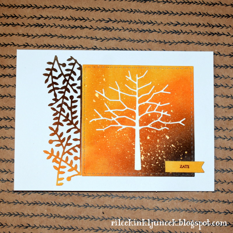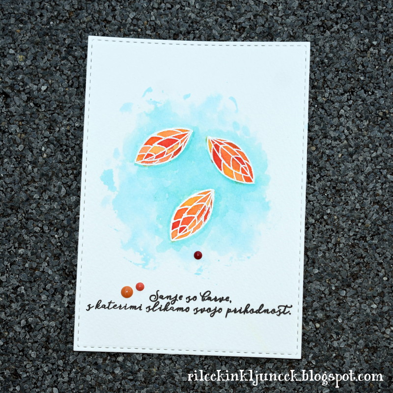 Najprej sem natisnila ozadje: štampiljko sem premazala s svetlo modrim Distress Inkom ter odtis posula s svetlečim reliefnim prahom. Iz pergamentnega papirja sem izrezala slabo polovico podlage ter jo z obojestranskim lepilnim trakom pritrdila na svoje mesto (bolje bi bilo, če bi z lepljenjem počakala.