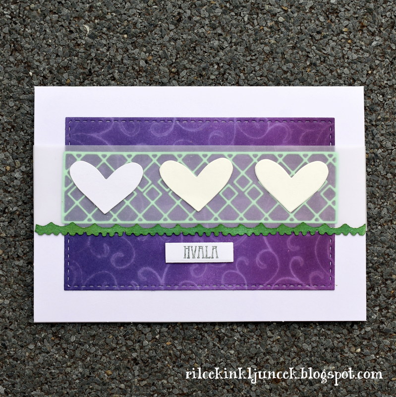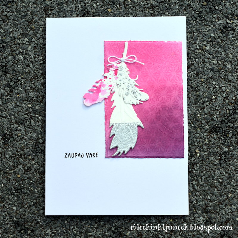 Na koncu sem vrvico zavezala v pentljo. Pentlja je dokaj velika, ker pa je vrvica zelo tanka, se lepo poveže z okolico ter doda celoti nekaj topline, saj so ostali elementi v izrazito hladnih barvah. Ker sem bila prehitra pri lepljenju na podlago, embosiranje voščila ni prišlo v poštev. Nazadnje sem izbrala edini izrezani besedi s prazničnimi voščili v moji lasti. Pergamentni papir je pritrjen samo na zgornjem delu, vseeno ne preveč štrli iz podlage. Še čez noč ga bom pustila pod utežmi in se bo lepo prilegal podlagi.