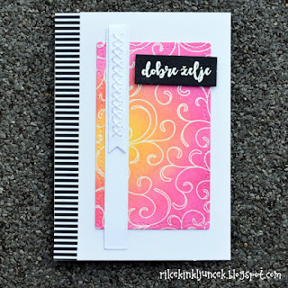 Podlago sem senčila skozi šablono, ki sem jo ustvarila s kovinsko rezalno šablono, nato sem izrezala kartonček, ki sem ga spodaj senčila z zeleno, natisnila rožico in metuljčka. Oboje sem pobarvala s Copic markerji. Medtem ko sem jelenčka odtisnila na bel papir in ga pobarvala z Distress Markerji in čopičem. Na koncu sem natisnila še štampiljko z voščilom namesto trave in na kartonček privezala vrvico.