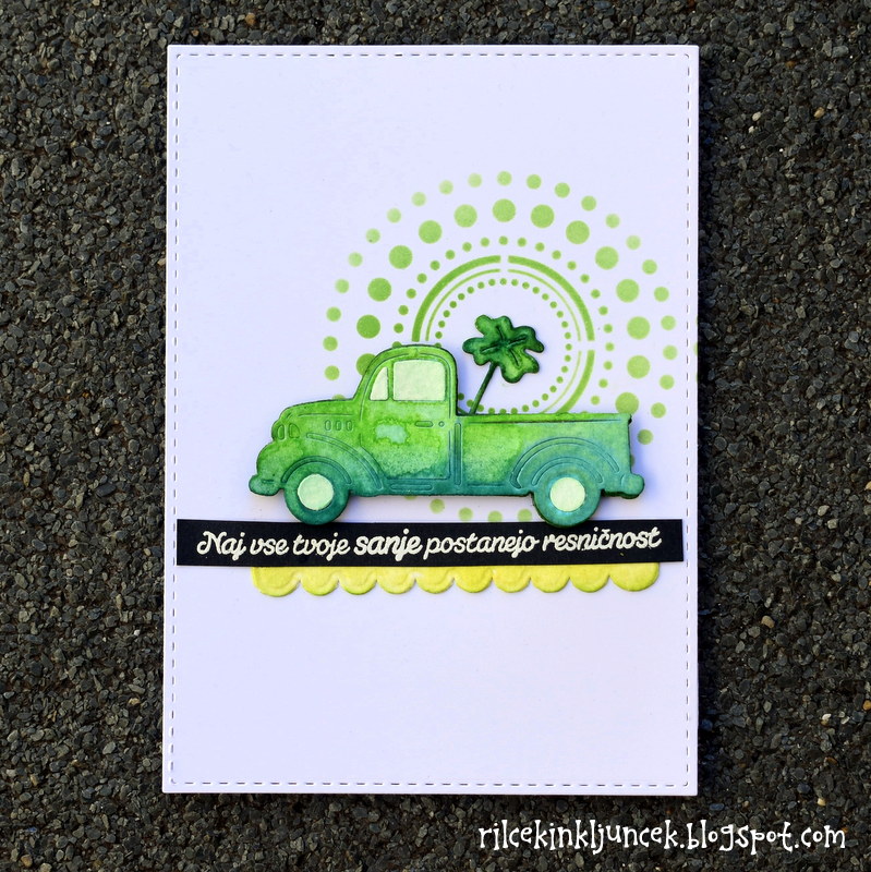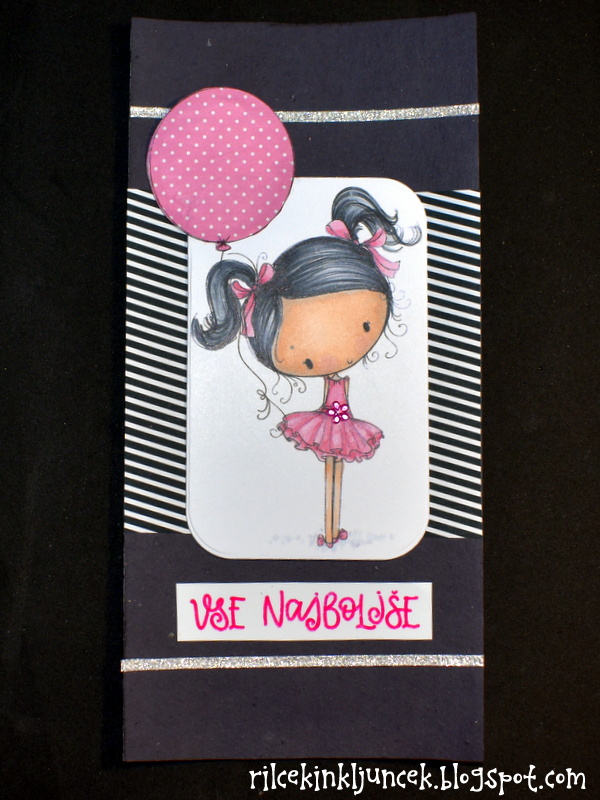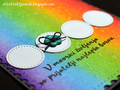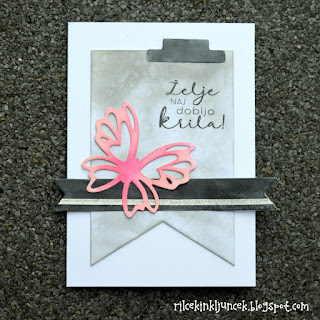 Tokrat sem risala. Narisala sem skodelico in tri cvetove z nekaj listja ter jih pobarvala s Copic markerji. Napis sem natisnila z računalnikom. Ozadje sem okrasila le z embosiranim vzorcem, ki sem ga pridobila z uporabo rezalne šablone.