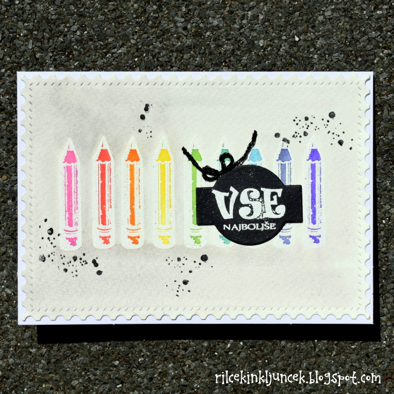 Najprej sem iz akvarelnega papirja izrezala kartonček z nazobčanim robom, na katerega sem toplotno embosirala niz barvic. Barvice sem nato pobarvala v mavričnih barvah. Barvala sem z Distress Inki in čopičem. Preden sem dodala voščilo, sem odtisnila še nekaj črnih pack.