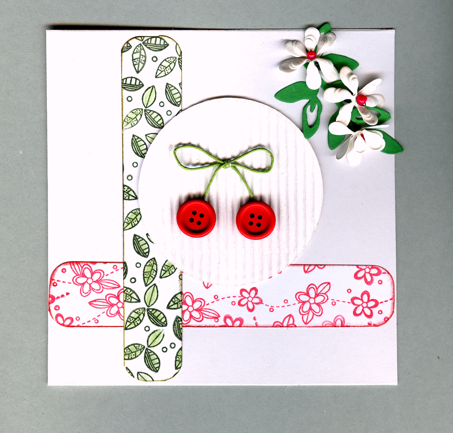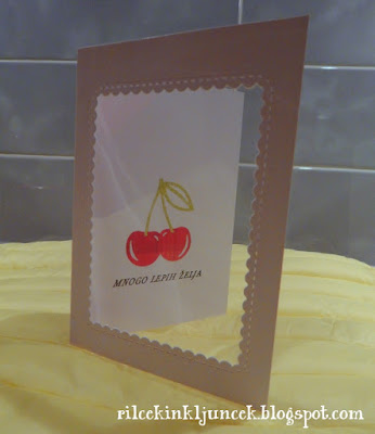 Tako sem češnjo iz dveh različnih vzorčnih papirjev nalepila na notranjost voščilnice, nad voščilom. Mislila sem, da sem že končala, vendar mi na novo nastsalo okno ni delovalo najbolj stabilno, zato sem dele povezala s prozorno folijo. Zdaj pa je v redu, čeprav ni to, kar sem si predstavljala na začetku.
