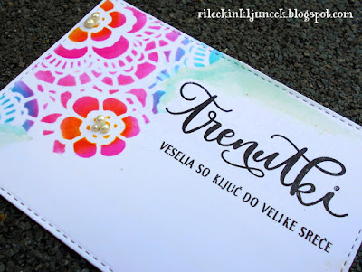 Najprej sem dvakrat natisnila papir tokratnega sponzorja Digital paper. Papirji imajo zelo romantičen pridih, zato sem tudi sama izdelala voščilnico s čipko, cvetjem in metulji. Oba papirja sem obrezala ter manjšega zalepila na sredino večjega, da se na robovih vzorec podvaja. Preden sem ju dokončno pritrdila skupaj s 3D blazinicami, sem še okrasila manjši kvadrat.