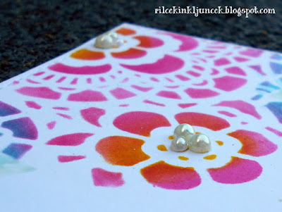Na sredino manjšega kvadrata sem zalepila trak belega obojestranskega lepilnega traku, da sem nanj pritrdila čipko z obeh strani. Prvotni namen je bil, da bom na sredino zalepila trak, ker pa mi je bila lahna prosojnost lepilnega traku všeč, sem ga preprosto posula s pudrom, da je izgubil svojo lepljivost. Te rožice imam že celo večnost, a sem malo pozabila nanje ... sestra mi jih je prinesla že pred leti, ko je šla v Vietnam. So iz papirja bele barve, zato sem jih pobarvala s Copic makrerji, da sem dobila približno iste odtenke kot na cvetju iz papirja.