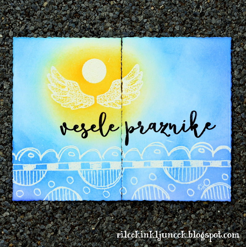 Ko se je podlaga posušila (pomagala sem si z grelno pištolo), sem nanjo odtisnila snežinko oz. njen del ter ga posula z belim reliefnim prahom. Na koncu sem dodala samo še tri preproste besede, ki ponazarjajo bistvo božiča in želja v novem letu. Zato tudi to objavljam danes, zadnji dan v letu 2019.