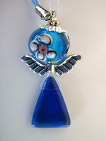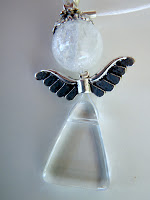 Podlago sem prebarvala s kombinacijo bele, modre in črne akrilne barve. Spodaj levo sem uporabila največ bele, zgoraj desno pa največ črne. Angela sem natisnila na 100-gramski papir in ga pobarvala s Copic markerji. Obrezala sem ga tako, da sem pustila 2-milimetrski rob, ki sem ga pozneje pobarvala s tankim čopičem, da se ujema s podlago. Preden sem angela zalepila z lepilom v spreju, sem s teksturnimi šablonami dodala metulje in luno. Nekaj zvezdic sem ustvarila tako, da sem poškropila belo akrilno barvo, nekaj sem jih naredila z barvo, ki se sveti v temi. Z isto barvo sem prebarvala tudi luno (osnova je bela akrilna barva).