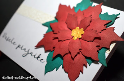 Najprej sem izrezala kvadrat ter mu z manjšim kvadratom odščipnila vogal, ki sem ga nadomestila s koščkom temno sivega papirja. Na beli podlagi sem ustvarila relief na pike, ki spominja na sneg. Sicer sem nameravala uporabiti srajčko z geometrijskim vzorcem, vendar je bila preozka za ta kvadrat. Nazadnje sem naredila še božične zvezde. Rezalne šablone zanje imam zelo dolgo in jih pogosto uporabljam, vendar ne za božične zvezde. Sredice cvetov sem okrasila z drobnimi zlatimi kroglicami. Dodala sem še nekaj listov. Preden sem božične zvezde zalepila na svoje mesto sem na odrezano mesto dodala črn trak z besedami ... v bistvu sem naredila dolg trak z različnimi besedami, odrezala sem ga le delček.