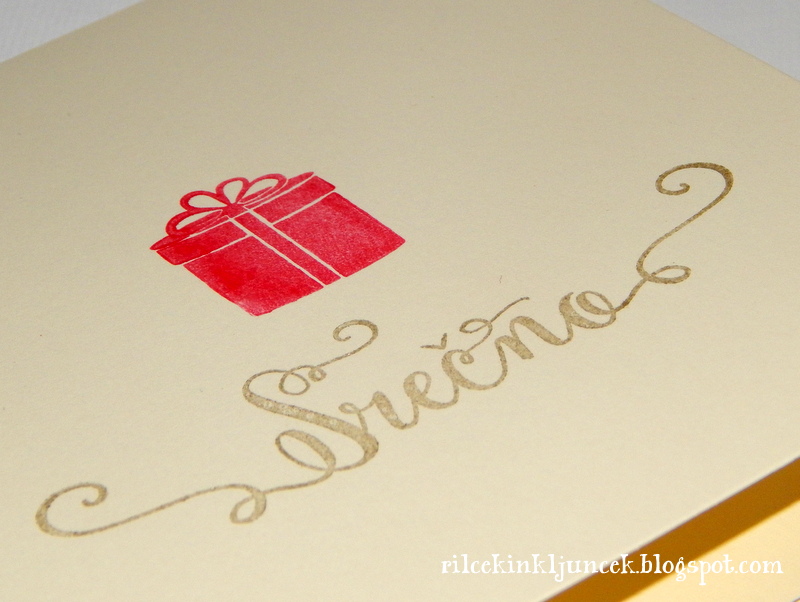 Najprej sem z belim reliefnim prahom odtisnila snežinko, voščilo in mali darilni paket, nato sem darilni paket zaščitila, da se ni obarval ... sledilo je namakanje v barvi. Barve sem nanesla na mizo, jih malo poškropila z vodo der v to mešanico namakala zgornji levi in spodnji desni rob kartončka. To sem večkrat ponovila, predvsem z modro. Uporabila sem odtenke Broken China, Crushed Olive in Shabby Shutters. Mali darilni paket sem še pobarvala z belo barvico.