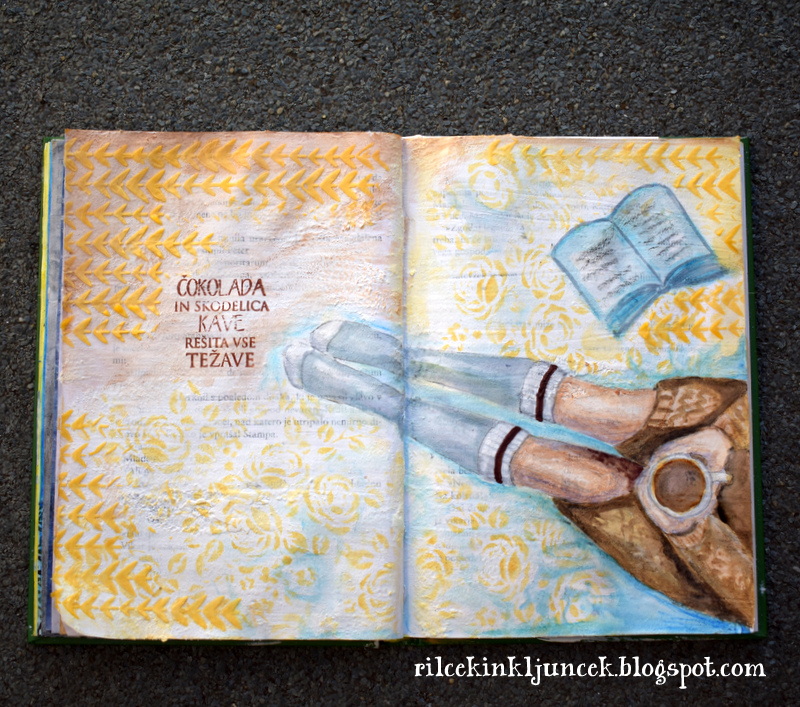 Podlago sem prebarvala s črno akrlino barvo, nato sem dodala malo rjave, pa malo zelene in modre, ki sem ju že prej precej neenakomerno zmešala skupaj, pa spet malo črne, malo zlate ... bakren embosing, malo lepila in štempljala ... zadnje je prišlo na vrsto najpomembnejše - napis.