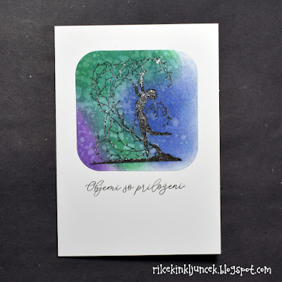 Najprej sem natisnila ozadje: štampiljko sem premazala s svetlo modrim Distress Inkom ter odtis posula s svetlečim reliefnim prahom. Iz pergamentnega papirja sem izrezala slabo polovico podlage ter jo z obojestranskim lepilnim trakom pritrdila na svoje mesto (bolje bi bilo, če bi z lepljenjem počakala.
