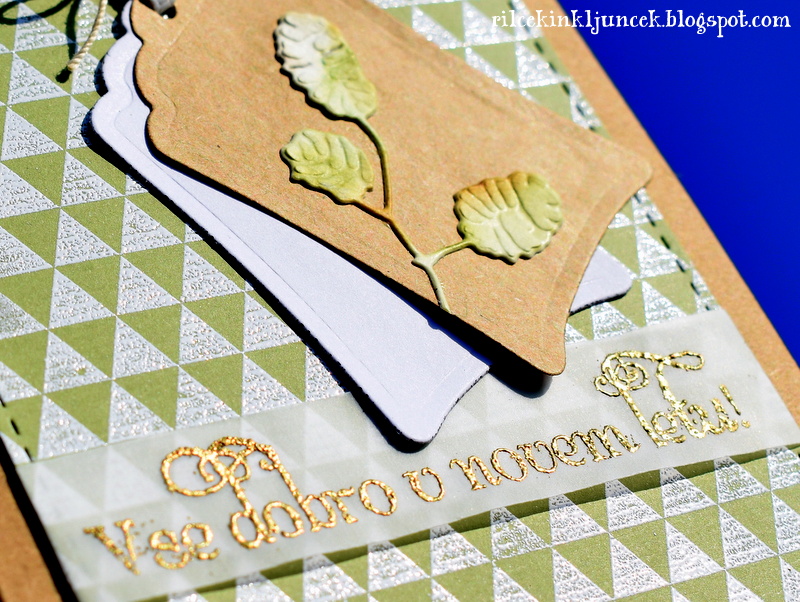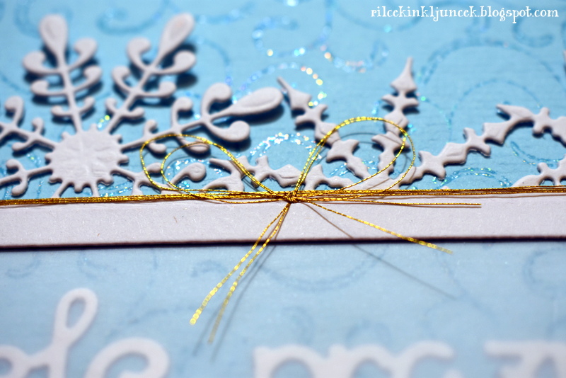 Na koncu sem vrvico zavezala v pentljo. Pentlja je dokaj velika, ker pa je vrvica zelo tanka, se lepo poveže z okolico ter doda celoti nekaj topline, saj so ostali elementi v izrazito hladnih barvah. Ker sem bila prehitra pri lepljenju na podlago, embosiranje voščila ni prišlo v poštev. Nazadnje sem izbrala edini izrezani besedi s prazničnimi voščili v moji lasti. Pergamentni papir je pritrjen samo na zgornjem delu, vseeno ne preveč štrli iz podlage. Še čez noč ga bom pustila pod utežmi in se bo lepo prilegal podlagi.
