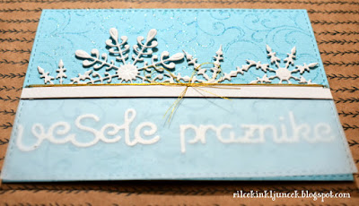 Snežinke sem najprej izrezala iz pergamentnega papirja, vendar so bile komaj opazne, zato sem pergament zamenjala z belim debelejšim papirjem. Tudi to sem pritrdila na svoje mesto, ker pa je bila šablona malo krajša od širine voščilnice, sem morala dodati še okrasni trak. Nad trakom sem na obeh koncih naredila majhno luknjico ter skoznjo večkrat ovila tanko zlato vrvico.