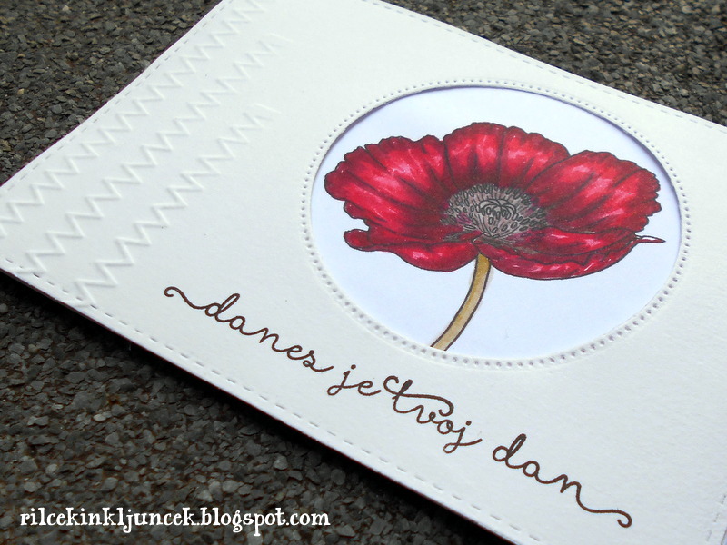 Tokrat sem izbrala motiv preprostega cvetja Scribbled Floral 1. Cvetlični motiv sem odtisnila na bel kartonček. Barvala sem s Copic markerji - levo stran sem tudi senčila z njimi, desno pa sem uporabila Distress Inke. Nato sem na podlago odtisnila besedilo "iz srca", nad njega pa sem zalepila besedo "hvala", ki sem jo izrezala iz belega kartončka, pobarvanega s Copic markerji.