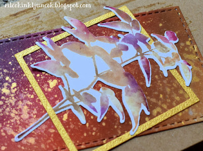 Najprej sem se lotila senčenja. Uporabila sem celo paleto Distress Inkov - od vijolične do krem barve. Nazadnje sem podlago poškropila z zlatim Izink tušem. Medtem ko se je podlaga s pozlato sušila, sem se lotila listja.