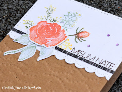 Med gledanjem televizije pogosto vzamem barvice ali Copic markerje in barvam natisnjene podobe digitalnih štampiljk. Med najbolj priljubljenimi so podobe A Day for Daisies, na srečo jih imam kar nekaj. Pobarvano plesalko sem obrezala in zalepila na osnovo iz eko papirja. Robove sem še poudarila tako, da sem narisala valovid rob.
