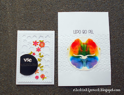 Packo sem naredila z Izink tuši, ki sem jih poškropila z vodo. Če bi hotela tako packo stlačiti na navadno voščilnico (A6), bi krog segal od roba do roba, kar pa ni preveč estetsko. Obrezati packo pa bi bilo škoda, saj je njena oblika prav zanimiva. Spominja me na možgane, zares kreativne možgane, saj so mavrični ... kaj to pomeni?!