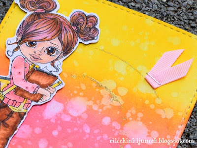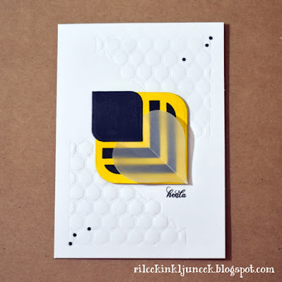 Ozadje sem imela že embosirano (z rezalno šablono), nato sem izdelala čebelico. Uporabila sem kombinirana kompleta štampiljk in rezalnih šablon. Za podlago sem uporabila debelejši rumen papir, ki sem ga še dodatno senčila z rumenim Distress Inkom, da sem pridobila intenzivnejšo barvo. Nato sem odtisnila črne črte - za to sem uporabila pripomoček za odtiskovanje, saj sem želela zares intenzivno črno barvo in sem štampiljko najmanj štirikrat namazala s črno blazinico. Sledilo je rezanje. Poleg tega, da sem obrezala štampiljko, sem iz pergamentnega papirja izrezala srce ter iz črnega papirja manjši lik, ki sem ga uporabila predvsem, da sem pričvrstila srce-krila, na svoje mesto.