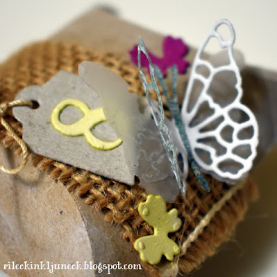 Odtisnila ter izrezala sem samoroga ter kos traku z zlatimi bleščicami. S tem trakom sem prekrila vzmet, s katero je pritrjen samorog na podlago. Samoroga sem pobarvala s Copic markerji. Na koncu sem dodala še kartonček s številko.